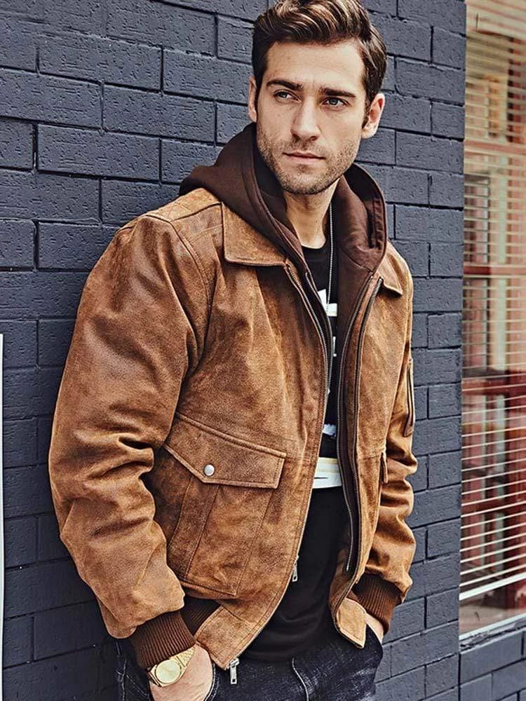 Outer Shell Material: Suede Leather Inner Shell Material: Polyester Features: Crew Neck Closure: Zip Outer pockets: Two Inner pocket: Two Color: Tan Brown Style: Bomber Jacket