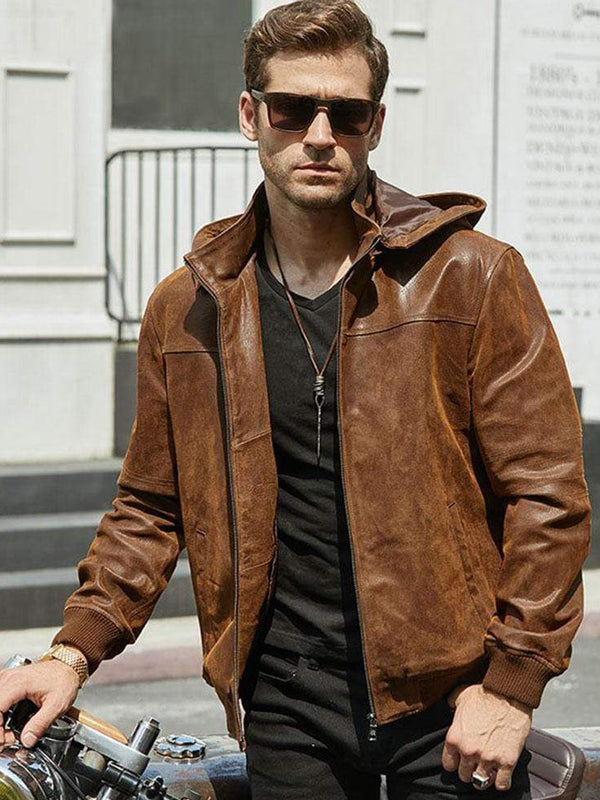 Men’s Tan Brown Distressed Leather Removable Hood Bomber Jacket